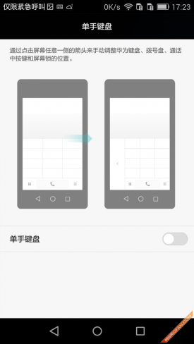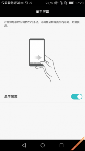 华为P8青春版的特色功能在于为大屏幕定制了单手操作模式,在设置中开启之后,虚拟栏往右滑动便可以缩小整个屏幕。
