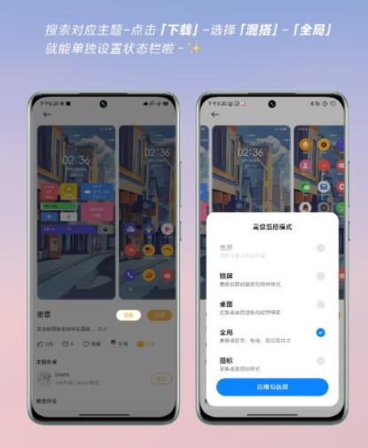 打开方式:「主题壁纸」—搜索图片上对应主题并下载—选择「混搭」—选择「全局」。