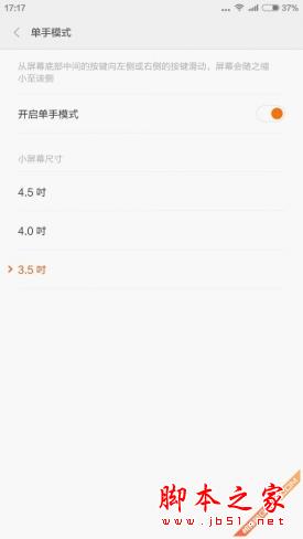而针对增大屏幕版本的小米Note,系统中同样提供了单手模式,只要在触控键中心分别往左右滑动,即可唤醒单手模式。用户可自由选择4.5英寸、4英寸、3.5英寸三种小屏幕尺寸。