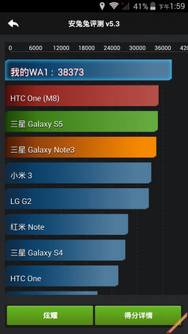 根据CPU-Z的实际检测我们看到,小哇手机采用了主频为1.7GHz的MT6752八核64位处理器,搭配2GB RAM+16GB ROM内存组合,这样的配置放在整个行业内都能算的上是主流配置了。那么它的性能表现又会如何呢?我们主要通过三款跑分软件以及游戏应用加一个高分辨率视频来对小哇手机进行实际的测试,接下来我们就来看一下测试结果。