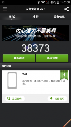 安兔兔跑分(AnTuTu Benchmark)是一个专门给Android系统的手机、平板电脑硬件跑分的软件,它能一键运行完整测试项目,通过内存性能、CPU整数性能,CPU浮点性能、2D、3D绘图性能、数据库I/O、SD卡读、写速度等多项性能测试,并对手机的整体和单项硬件性能做出评分,同时上传分数并查看该设备在世界的排名。