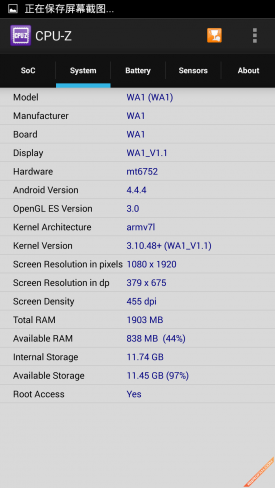 在了解了小哇手机的芯片之后,我们再通过CPU-Z来实际检测一下小哇手机的硬件配置情况。