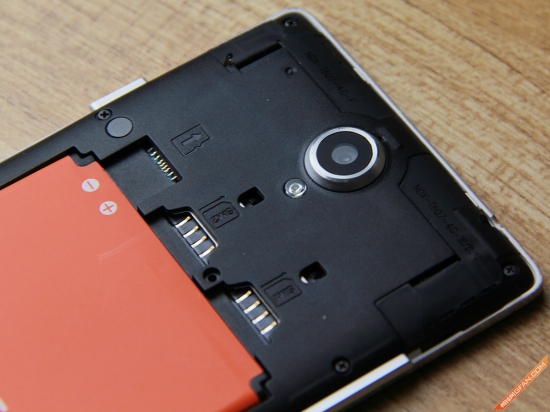 看完了机身外部,接下来我们再到机身内部去看一下,拆开后壳之后,我们看到手机中内置了一块2650mAh电池,同时在电池仓上方为两个Micro SIM卡槽以及一个Micro SD扩展卡槽,值得一提的是,网络制式支持TD-LTE+WCDMA+GSM的小哇是没有卡1、卡2之分的,做到插哪个用哪个,同时移动3G用户需要注意一下,目前小哇手机还暂时不支持TD-SCDMA移动3G网络,当使用移动3G SIM卡时,手机会自动将网络回落到移动2G,也就是GSM网络。