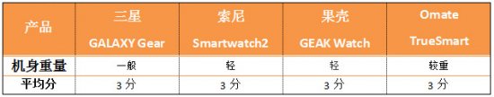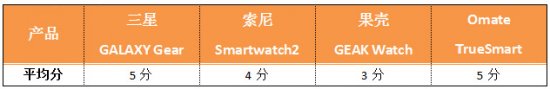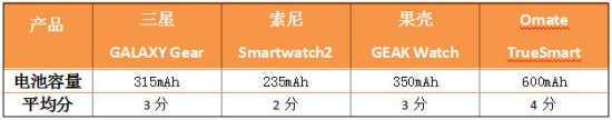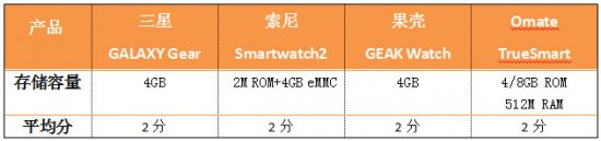 编辑点评:依照目前已曝光的处理器参数来看,Omate TrueSmart、果壳GEAK Watch和三星GALAXY Gear的内存容量都达到了至少4GB,足以满足正常使用存储信息所需要的空间。索尼Smartwatch2并没有曝出其内存容量有多大,但根据笔者的实际操作使用,使用时并不会出现空间内存不足的情况,与其他三款产品不存在明显差异,因此得分一样。
