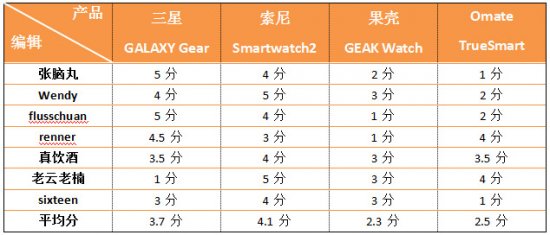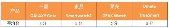 编辑评分:经过七位编辑的投票,单纯以外观来说,索尼Smartwatch2的得分最高,三星GALAXY Gear次之,果壳GAEK Watch的得分最低。不过在此次投票中笔者发觉,男女编辑在外观视觉上有明显的差异,厚重的Omate TrueSmart在男性眼中普遍觉得很“Man”。