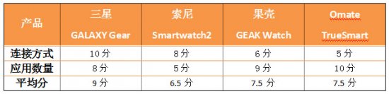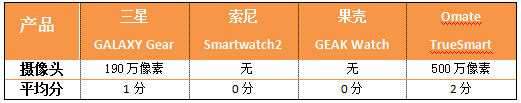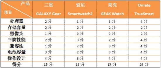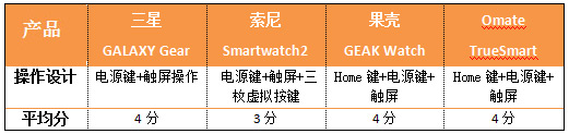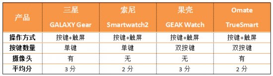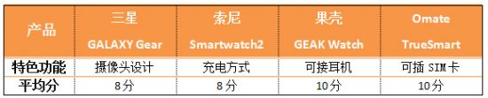 编辑评分:在按键设计方面,四款产品各具优势,因此分值差距不大。三星最大的亮点在于其将摄像头设计在了表带上,虽然看起来怪异,但使用起来十分方便;果壳则配备了3.5mm耳机接口,用手机打电话变得更为科学。Omate允许手表自行插SIM,单独工作,不用依赖智能手机的辅助;索尼则表现的中规中矩。