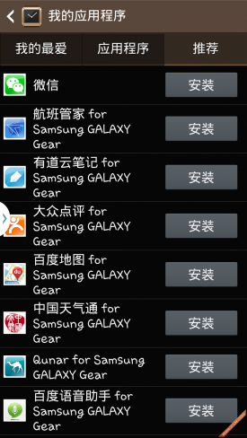 除了预装的多项常用应用外,用户还可以通过智能手机为三星GALAXY Gear安装十余款专门针对Gear适配后的应用,涉及了健身、地图、社交等多个方面,虽然数量不多,但质量很高,常用的软件基本都有覆盖,满足日常使用毫无问题。