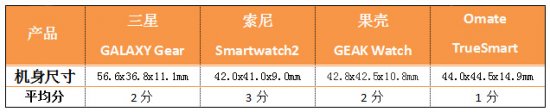 机身尺寸评分标准:智能手表虽然拥有众多智能的成分,但是作为一款戴在手腕上的产品,若是没有一个小巧的身材恐怕也不能让大多数用户买账。笔者将所有产品的身材尺寸进行罗列,进行了小巧指数评定,满分为3分,以1分递减,最低分为0分,不同机型可以分值相同,即获得身材评分结果。