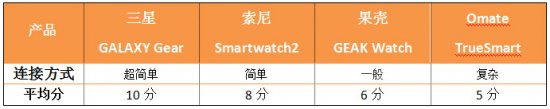 小结:从连接方式上看,指定几款连接对象的三星连接起来最为方便。其次是索尼Smartwatch2和果壳GEAK Watch,而Omate TrueSmart虽然连接起来并不难,但与手机配合使用的软件找起来却并不容易,这款名为“奇异果手机助手”的应用要是能加入到手机内存里自动添加想来会方便许多。