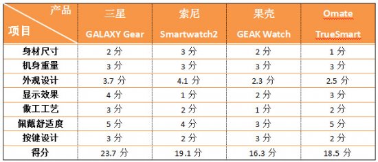 小结:外观设计得分由七个分项测试的进行汇总所得,其中三星GALAXY Gear的得分最高。单一外观来说,三星GALAXY Gear的表现确实不错,无论是年轻的时尚用户,还是高端的商务精英都非常适合佩戴。