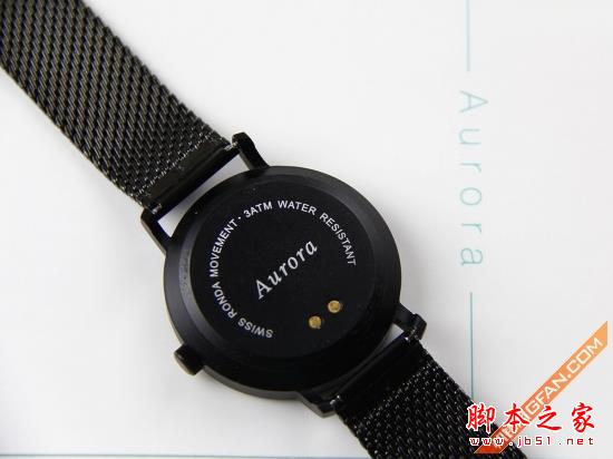 手表表盘的背后设计的比较简单,最中心是Fii Aurora的Logo,上部分别写着这块手表所采用的机芯以及防水级别。当然,其中最引人注目的要数Logo下方的两个触电,这是Fii Aurora智能手表智能模块采用的锂电池的充电接口,这也是Fii Aurora智能手表与市面上大部分石英手表不同的地方。