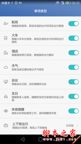 在设置内可以看到情景智能选项,在这里我们可以自定义提醒事项类型,如航班、火车、酒店、天气、会议、生日、休息提醒、上下班出行等。
