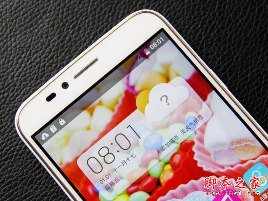 机身正面为一块5.0英寸屏幕,正面整块玻璃面板只有与机身契合程度非常高。略微高出屏幕玻璃面板的边框将整块玻璃牢牢包裹住,玻璃面板与边框的接缝处也没有过大的缝隙。