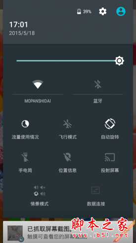 TCL ono P620M采用一级菜单,将所有的应用图标都罗列在主屏幕内。下拉通知栏为单页模式,默认显示通知,需要再向下拖拽,就可以看到快捷设置选项。