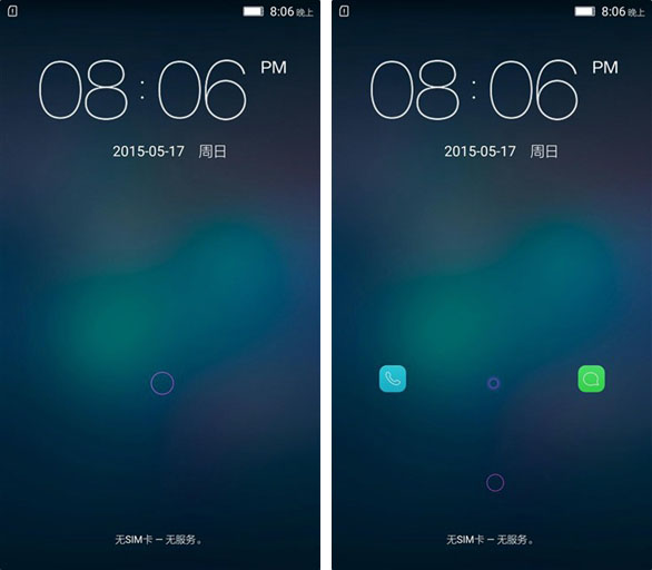 首先来看锁屏界面,它的锁屏采用向下滑动的解锁方式,向左或向右滑动可分别开启拨号和短信程序;锁屏上方为时间和日期的显示。