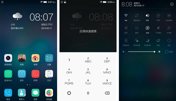 主界面并没有采用二级应用抽屉栏的设计,方便用户在安装应用后进行整理。从屏幕下方向上滑动可以开启应用快速搜索界面;屏幕上方向下滑动可开启通知栏,通知中心还内置了多种设置的快捷开关,方便进行快速设置操作。