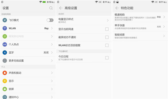设置界面采用白色底色,每一项设置用不同颜色的图标进行区分,识别起来非常方便。设置中还集成了对通知中心的一些高级设置,可调整电量显示方式、网速等信息;特色功能中,还能设置在黑屏时双击音量上或下来进行极速抢拍。