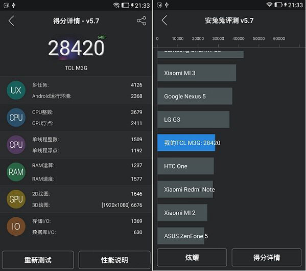 如上图,通过新版安兔兔V5.7跑分软件测试,可以看出TCL么么哒3S跑分超过了2.8万分,属于中等偏上性能水平,由于高通615八核处理器还内置了不错的图形核心,因此该机在性能上可以满足各类主流应用与游戏需求,如果是非大型游戏玩家,性能上还是可以满足大众用户需求的,此外,高通CPU也具备良好的兼容。