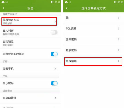 TCL么么哒3S特性功能体验TCL么么哒3S的最大亮点在于支持眼纹解锁,用户在设置界面的安全选项当中可以选择屏幕的锁定方式,选择眼纹解锁则可以进入眼纹录入界面,这在国产机中也是一项创新功能,具备更好的人机交互体验。