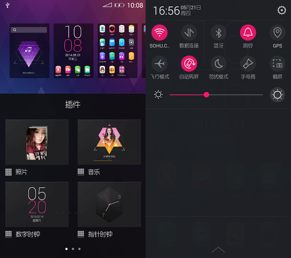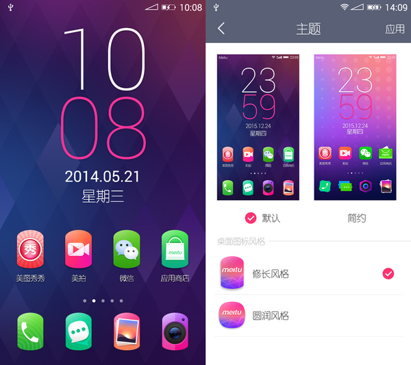 美图M4系统为定制的MEIOS2,风格和外观一样张扬有个性,不过整体还是与女性用户比较搭配,配色、插件等设计以女性审美优先。M4开机默认为细长图标,排列整齐,第三方图标也做了比较完美的适配。在个性化设置中,用户也可以自行选择主题,更改图标和主界面的风格。