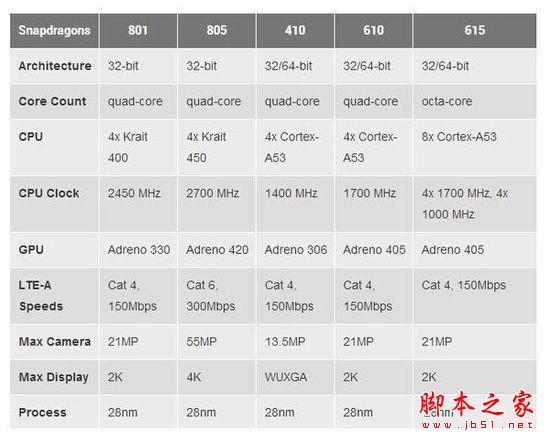 从高通新一代芯片产品图中可以看到,骁龙615是一款定位在中端级别的移动处理器芯片,其硬件性能也是属于中上规格。骁龙615这款处理器芯片并未采用高通自家的Krait内核,而是采用基于ARM原生的Cortex-A53的架构,并且是首款集成LTE和64位功能,具有8个核心的Cortex-A53解决方案。另外,这款SoC也采用了最新的ARMv8指令集,配备了Adreno 405 GPU,这次是将骁龙800系列处理器的Adreno 400系列GPU首次应用到骁龙600系列中。