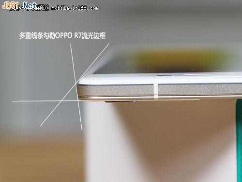 机身边框方面,是此次OPPO R7设计上最下功夫的一个环节。在其他手机仅在边框方面采用金属材质、CNC倒角切削、NMT纳米工艺注塑等工艺同时,OPPO R7在边缘方面设计了更多的线条,OPPO称之为流光侧边。而楔形的边框能够提升握感,不会出现握持不稳的状况。并且凹形CNC条在目前智能手机中也十分少见。