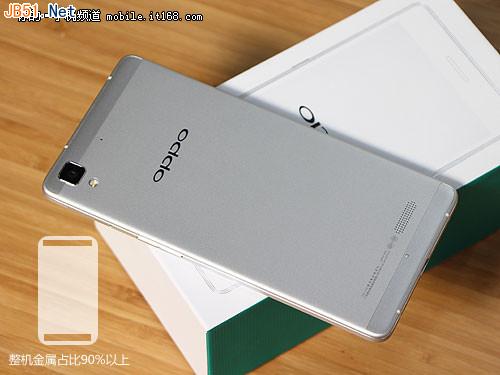 机身背面方面,OPPO R7采用了航空铝材金属材质一体化切削工艺,并且表面进行了阳极氧化和喷涂处理,使得表面拥有哑光的效果,并且手感较为细腻。值得一提的是OPPO R7的整机金属占比达到了92.3%,除去必要的信号溢出注塑条外,基本上保留了全部金属的手感。