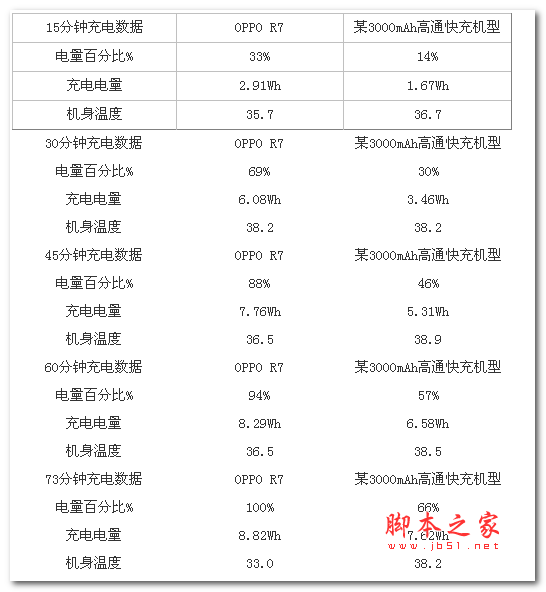 充电数据方面,我们将采用OPPO VOOC闪充功能的OPPO R7和采用高通QuickCharge技术的机型同时充电对比。充电时间、充电电量、充电温度对比表格如下: