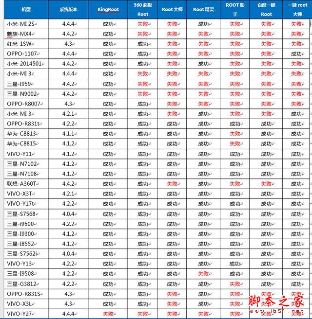 因为root是否成功与系统版本关系很大,所以有必要讲解一下系统分布的构成,本次评测中,4.2和4.4的系统最多,分别都有9台,4.4因为系统较高,相信失败率都是较高的部分。较老的4.1系统和4.0系统分别有6和2台,这些老系统手机相信是各个root工具刷分的关键,如果出现root失败,基本可以认为能力一般。而4.3系统有4个,也是较新的系统。这个分布也基本符合,目前Android版本分布。