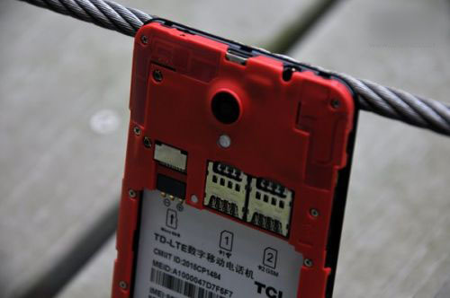 打开后壳,眼前红彤彤一片,原来摄像头周围的红圈来自这里。该机支持双卡双待,1号卡槽支持电信4G网络,2号卡槽仅支持GSM网络(移动\联通2G网络)。