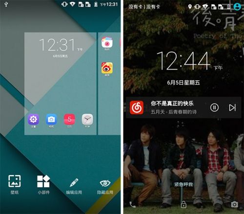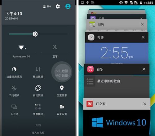 下拉通知栏仍然使用安卓5.0的双段式,第一次下拉显示通知,再次下拉则是快捷设置界面,里面加入了诸如双卡双待等的快捷设置,更加接地气。多任务界面和锁屏界面则跟原生安卓5.0系统的一样,操作顺滑流畅。