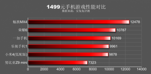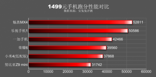 具体到性能方面,我们还是来看跑分数据吧——从跑分数据方面来看,魅族MX4和乐视手机1能够达到5万分以上,不过魅族MX4用的是MT6595,这款处理器是一款32位产品,而未来的发展趋势是64位,因此乐视超级手机1(MT6795)比较适合未来的发展潮流,另外乐视超级手机1采用3GB的RAM,这在多任务或者跑大程序方面占有优势;一加手机和荣耀6的性能都在4万分左右,这两款手机的优势是搭载了3GB RAM。至于努比亚Z9 mini它只能达到3万分出头,在处理器方面性能是最低的,从性能角度出发,笔者觉得它不值1499元。