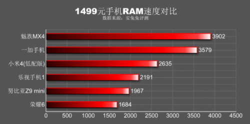 RAM速度对比,可以理解为手机读写内存的速度,这个分数当然是越高越好。在RAM速度对比方面,魅族MX4和一加手机有着绝对优势,而荣耀6的表现则令人意外,它跑去垫底了。乐视手机1的维持在中间位置,不算好也不算差。