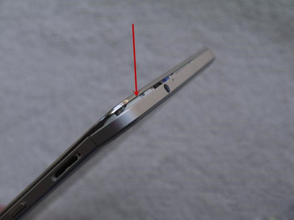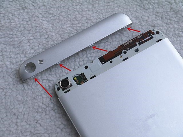 很顺利,就拆掉了顶部的小盖板,可以看见是用扣子来固定的,扣得相当的牢固,拆掉后,可以看见摄像头,闪光灯以天线等部件。