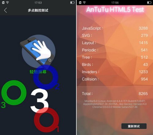 当然这款手机也有不尽如人意的地方,比如在安兔兔测试当中,手机触控只能到3点,如果放第四根手指上去就会卡死。一般情况下这个价位的手机均支持完美十点触控,不知道是与系统不兼容还是OPPO没有设计更多的触控感应。
