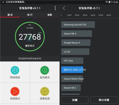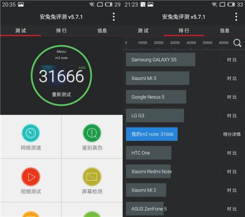 ▲左边为魅蓝 note 2 跑分结果,右边为么么哒 3S 跑分结果。