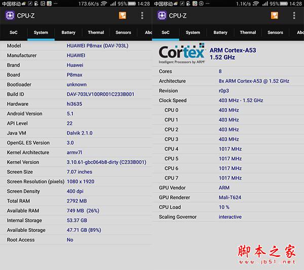 其中麒麟935采用八核Cortex-A53架构,四颗是1.5GHz主频的低功耗模式A53,另外四颗是2.2GHz主频的使用A53,从而组成big.LITTLE大小核的组合。