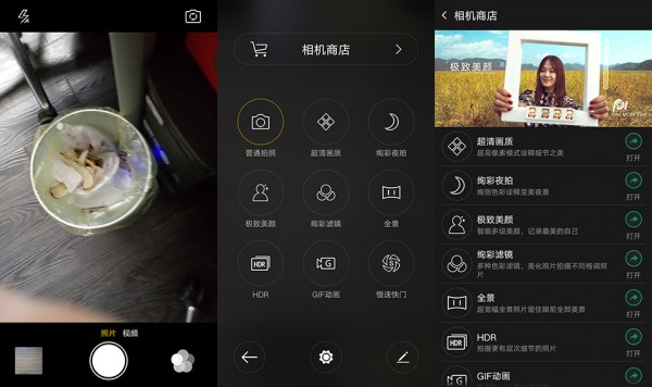 第一眼感觉和iOS的界面很相似,PI原画引擎2.0+最大的特色在于增加了“相机商店”,在功能模块有更多选择。包括超清模式、专业模式、超级微距等实用功能。“绚彩夜拍”模式是拍摄夜景的利器。