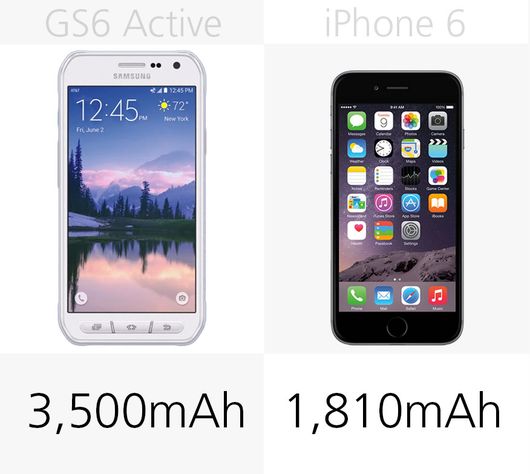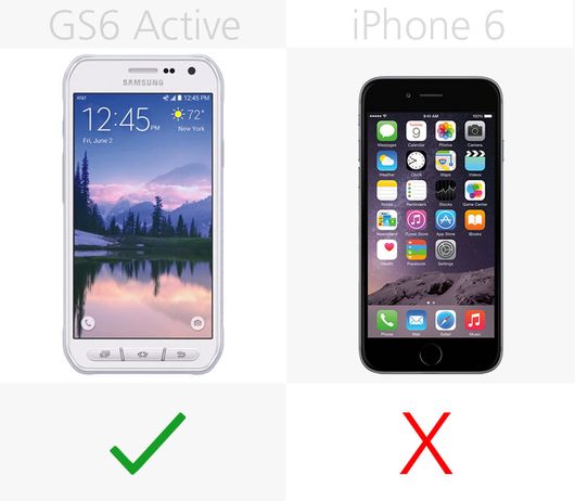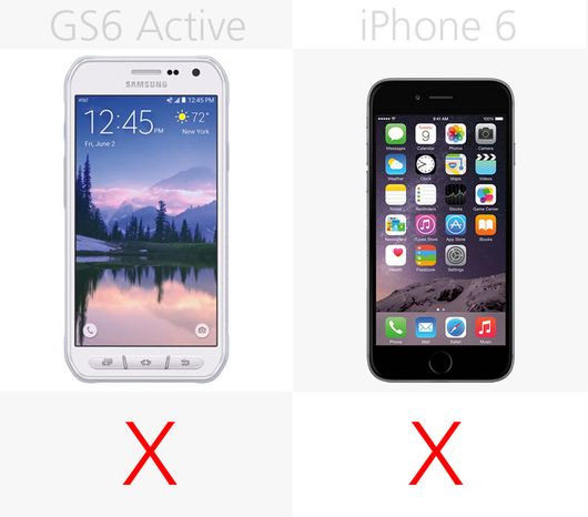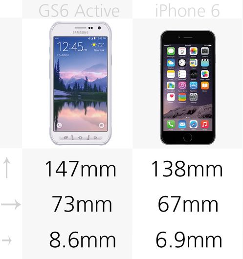 Galaxy S6 Active比iPhone6高7%,宽9%。同标准版Galaxy S6有所不同的是,Active版并不主打超薄和性感。iPhone在厚度上薄20%。