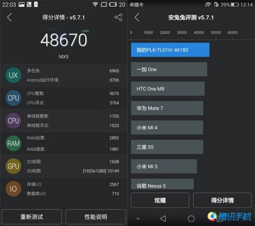看似相同的硬件配置背后,我也实际测试了一下他们的安兔兔v5.7.1的成绩,最终魅族MX5的成绩为48670分,荣耀7的安兔兔成绩为46180分。两款设备运行大型游戏均无压力,散热效果并未出现明显异常。