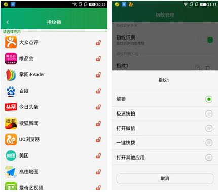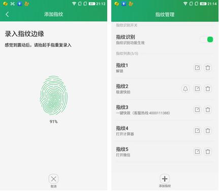 大神Note3最多可以录入5组指纹,指纹录入所需的时间相比iPhone 6来说要短了许多。在成功录入指纹之后,用户还可以针对每个指纹的功能进行自定义。目前大神Note3能够实现的功能包括指纹解锁、指纹支付、指纹快速拍照、指纹打开微信、指纹快速拨号、指纹加密应用以及不同指纹打开不同应用,功能非常全面。
