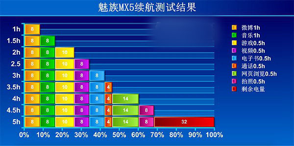 从测试中可以得出这样一个结论:魅族MX5在网页浏览的时候耗电最快,其次是玩游戏、看视频与拍照。而刷微博、听音乐、通话、看电子书等实用,耗电相对较少。