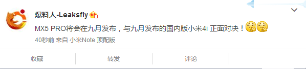 @爆料人-Leaksfly 刚刚在微博上表示,MX5 Pro将在9月份发布,与九月发布的国内版小米4i正面对决。