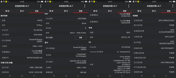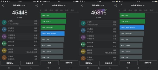 虽然OPPO手机一贯都不注重跑分,但毕竟是例行程序,跑分数据仅作为一个参考。OPPO R7 Plus的处理器升级至MT6795M,并配备3GB RAM和32GB ROM,从跑分结果来看R7 Plus维持在中上水准:45448上下(开启64位模式跑分达到了46816),性能上超越了R7,跑分结果不如主流旗舰机型。Color OS 2.1系统采用了基于Android 5.0系统的内核,也已经升级至64位。在图形性能方面,或许是软件问题,采用安兔兔的ESRating图形测试并不能体现跑分性能。而采用GFXBench 3.1测试后体现了实际水平。