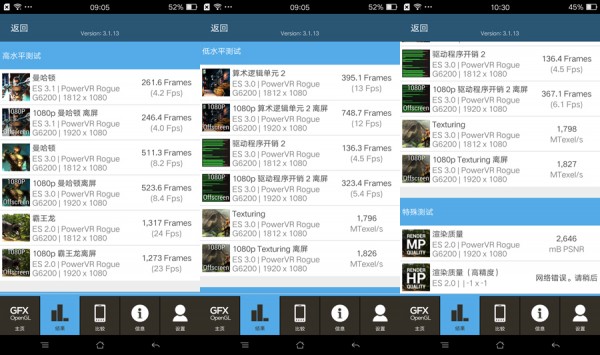 GFXBench 3.1跑分结果:曼哈顿测试(ES3.0)达到511.3帧(8.2FPS),霸王龙(ES2.0)达到1317帧(24FPS)