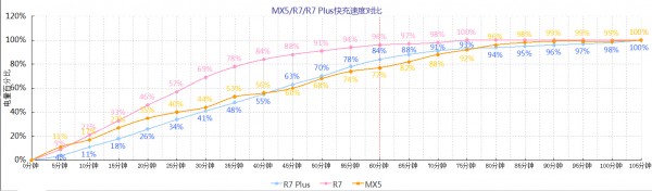 OPPO R7 Plus的大容量和闪充简直是绝配,笔者通过记录对R7/R7 Plus/MX5进行了闪充对比测试(每隔5分钟记录电量百分比),4100mAh的电量通过VOOC闪充完全充满仅需1小时45分,这与容量为3150mAh的MX5的mCharge速度相同。而2320mAh的OPPO R7完全充满时间为1小时15分,相比多出的76%电量,这样的闪充速度已经相当惊人了。