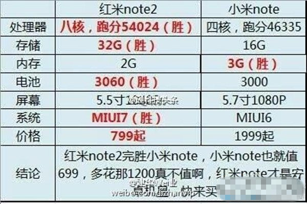 网友结论表示:“红米note2完胜小米note,小米note也就值699,多花那1200真不值啊,红米note2才是安卓机皇,快来买呀”!