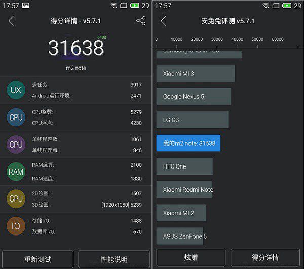 我们知道魅蓝Note2搭载了主频为1.3GHz的65位联发科MT6753八核处理器,运行2GB内存、16GB/32GB双版本存储,运行基于安卓5.0定制的Flyme4.5系统.通过此前的关于魅蓝Note2评测文章中,我们可以看出,魅蓝Note2相比上一代魅蓝Note性能有所下降,通过安兔兔V5.7跑分软件测试来看,魅蓝Note2安兔兔跑分31638分,比跑分近4万的上一代魅蓝Note安兔兔跑分要低一些。性能属于中端水准,还能能够满足日常需求的。