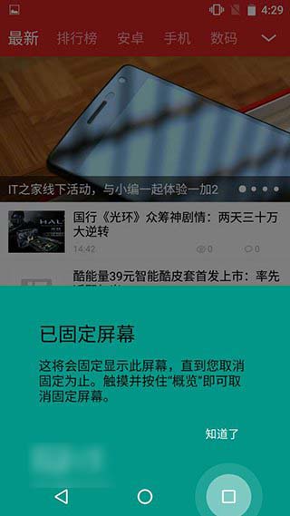 ▲被固定的屏幕无法返回主界面或者下拉通知栏