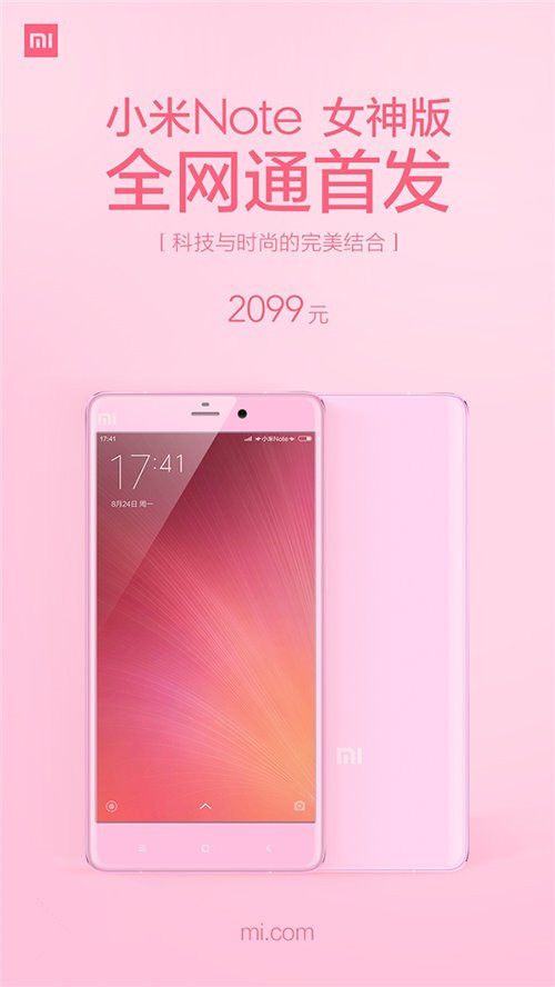 小米Note女神版全球首发2万台,定价2499元,也就是粉色版小米note,该机的配置和小米Note完全一致,包括5.7英寸1080p触控屏、四核2.5GHz骁龙801处理器、3GB内存、16GB机身存储空间、400/1300万像素摄像头等等。
